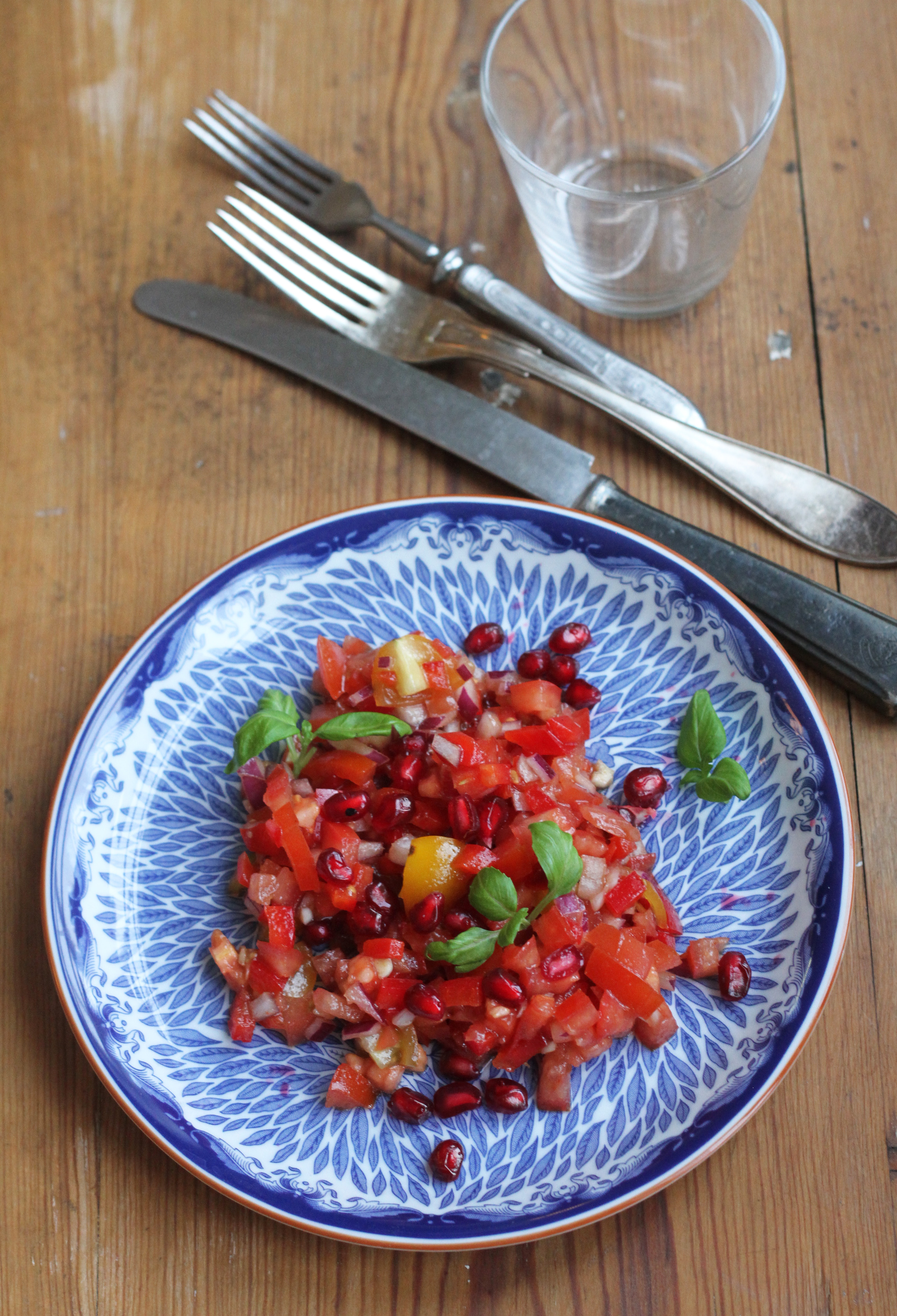 Sekoita ja levitä salaatti laakealle vadille. Ripottele päälle granaattiomenan siemenet. Koristele vielä yrteillä, jos haluat.
