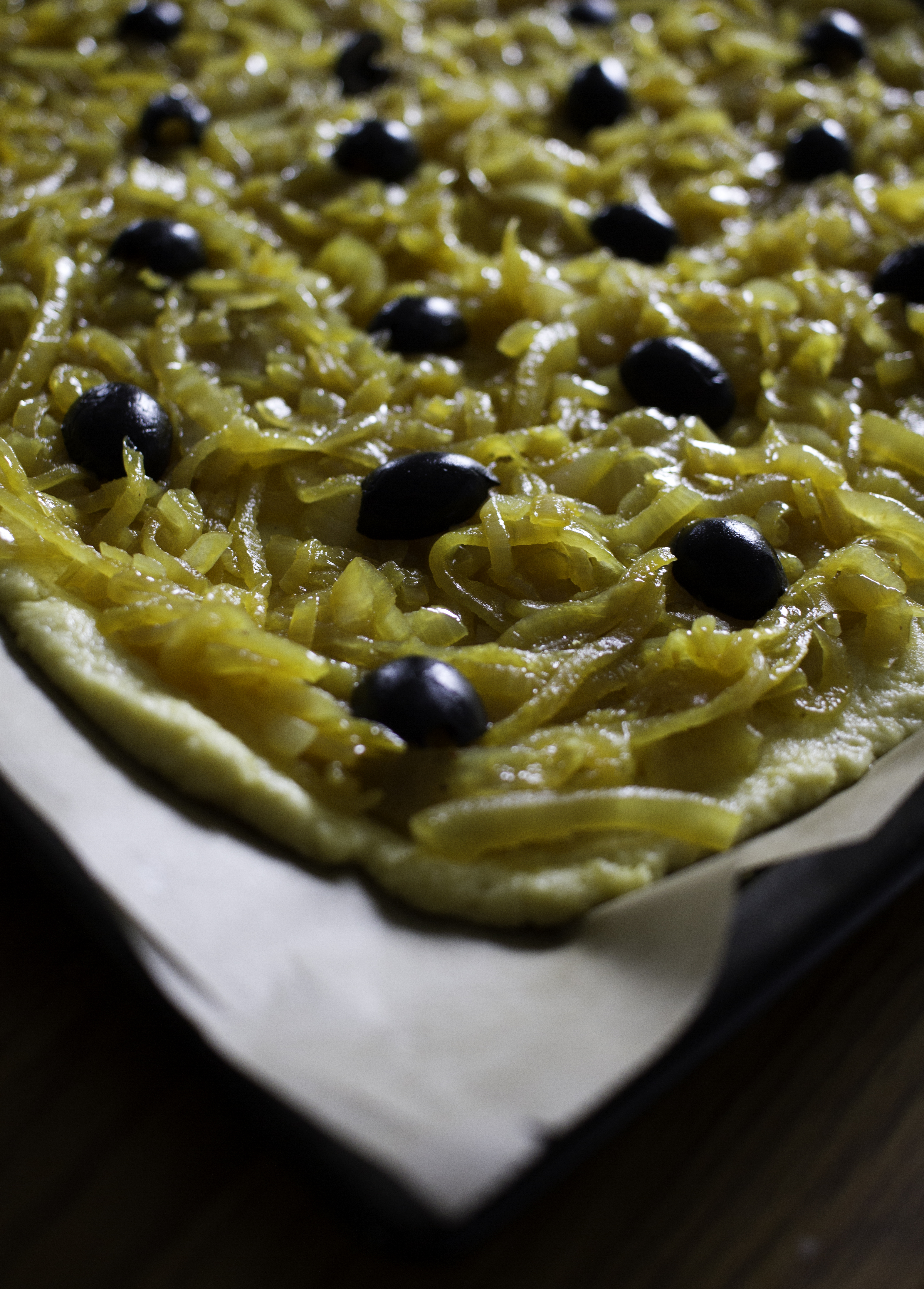 Tällä ohjeella syntyy kasvissyöjän versio ilman sardellifileitä, mutta kukaanhan ei estä lisäämästä niitä piiraan pinnalle, jos haluaa. Väitän, että makea sipuli ja sahrami riittävät kuitenkin oikein hyvin tekemään ohutpohjaisesta piiraasta ihan parhaan retkievään.