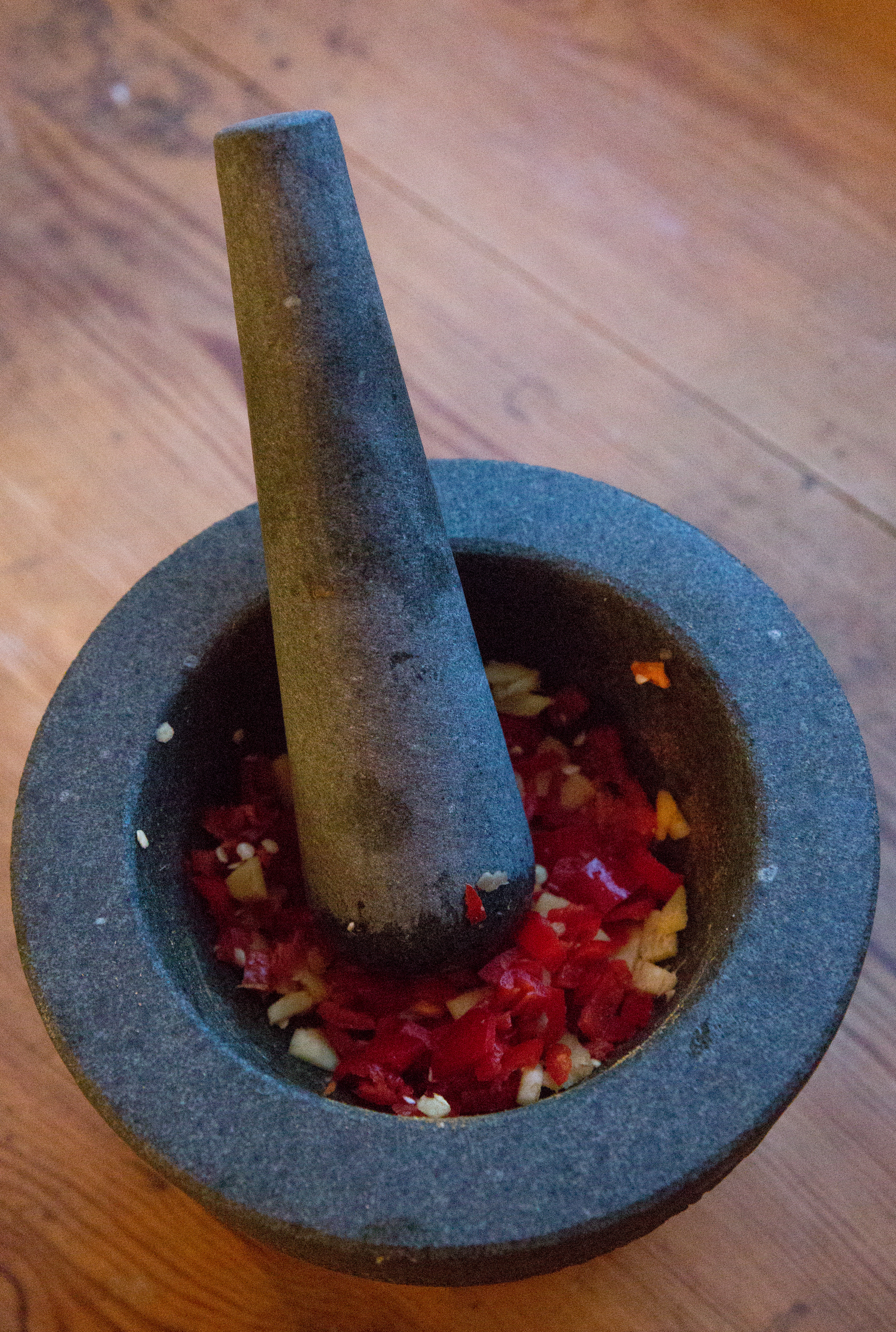 Pilko sitten chilit ja kuorittu inkivääri mortteliin. Älä poista siemeniä chileistä, jos haluat tulista ruokaa! Hiero chilit ja inkivääri morttelissa krouviksi tahnaksi. Sekoita mukaan äsken hienontamasi jeera.