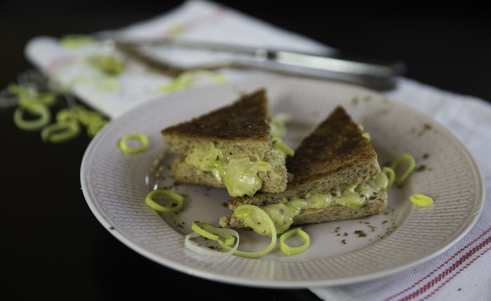 Sekoita sitten kastikkeeseen juusto, sinappi, za’atar ja purjosilppu.