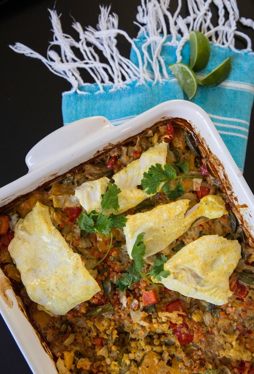 Jos aiot syödä myös kalaa, laita kuha- tai siikapalat maustumaan jugurttimarinadiin siinä vaiheessa, kun sipulit on työnnetty uuniin pehmenemään. Lisää kalat vuokaan linssiseoksen päälle, kun se on kypsentynyt uunissa noin 45 minuuttia.