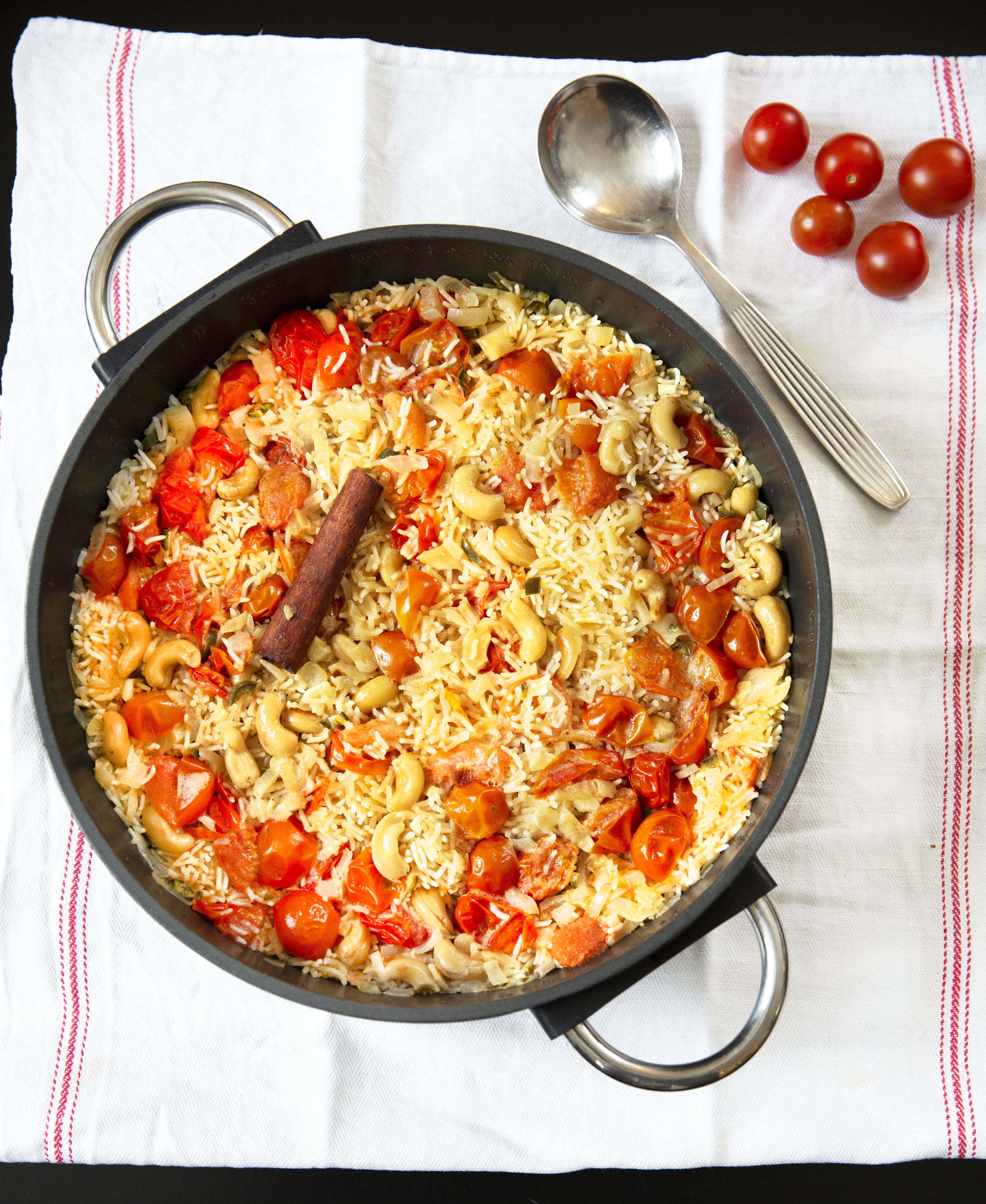 Hirveän vaikea päättää, mikä tässä on olennaisinta riisin lisäksi: tomaatit, kookosmaito, cashewpähkinät vai kaneli?