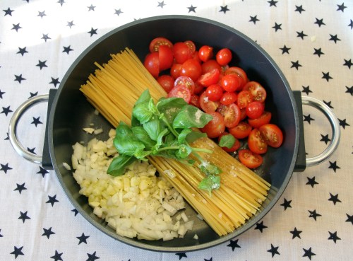 Vähän kyllä hirvitti: että laitetaan yhteen laakeaan kasariin kuiva pasta ja kaikki muut ainekset, kaadetaan päälle nestettä ja väännetään hellan levy täysille. Toimii!