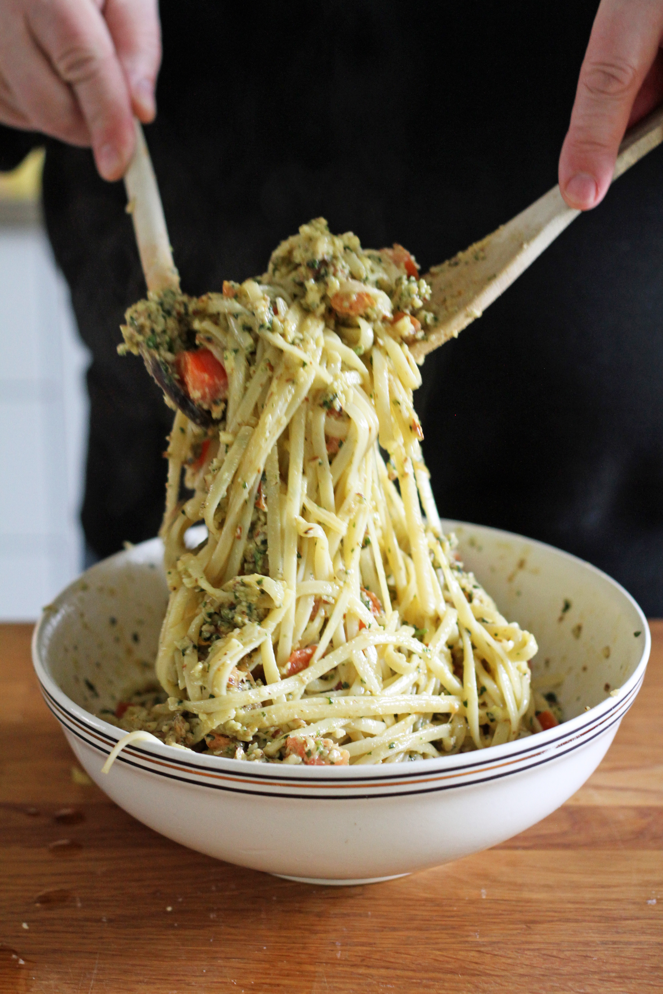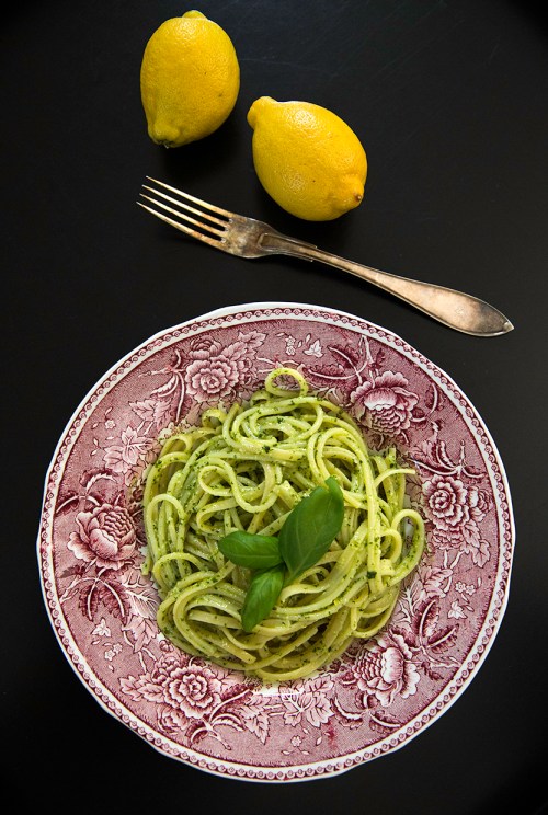 Alkuperäinen ohje on Jamie Italiassa -kirjassa nimellä Spaghetti alla trapanese, mutta se on hiukan virittynyt meidän keittiössämme. Rehevää, tuoksuvaa basilikaa ja pestosesonkia odotellessa tämä on hyvä alkusoitto.
