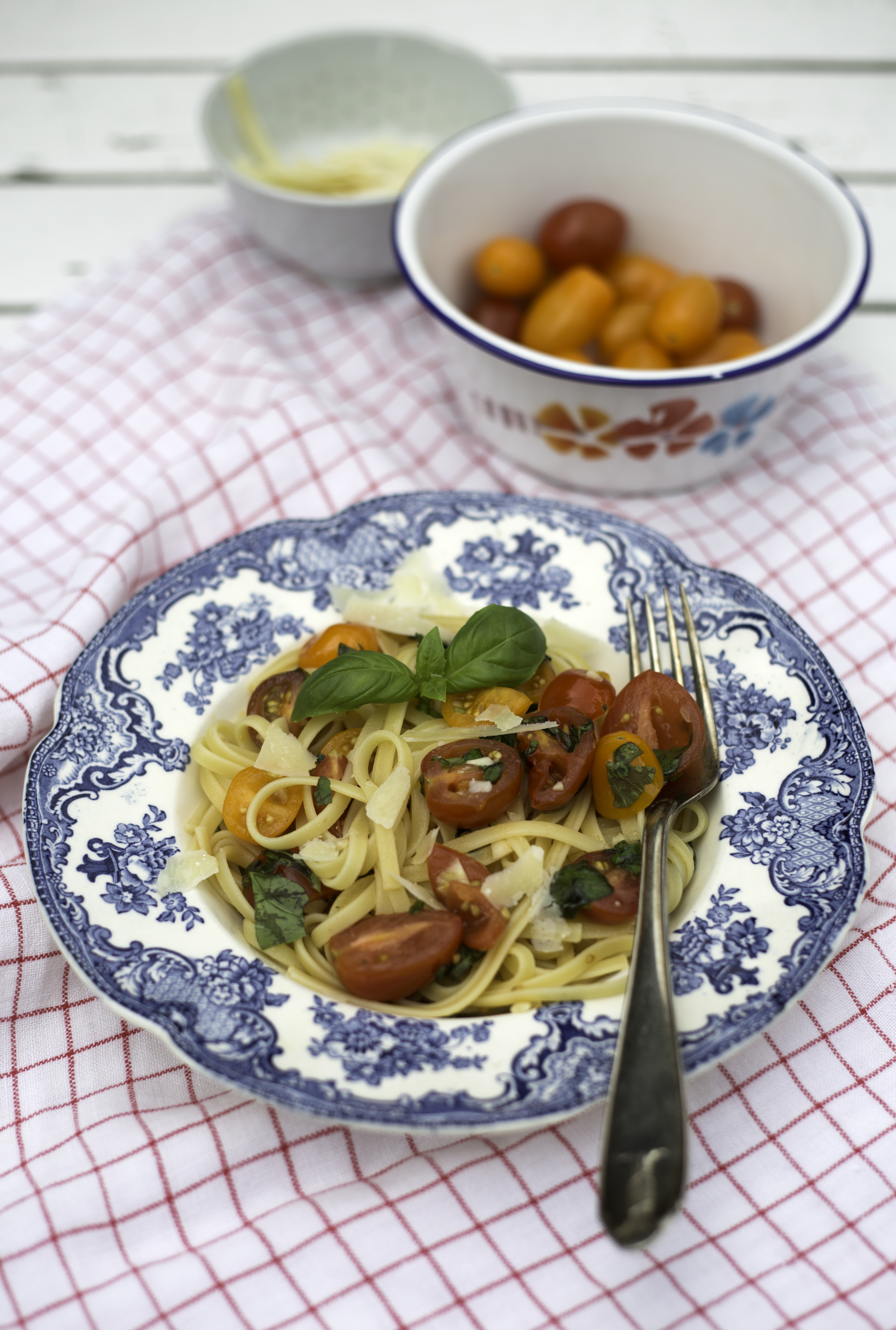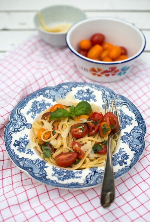 Valuta kypsä pasta. Kaada se kulhoon tomaattien seuraksi ja sekoita. Tarjoile parmesaanin kanssa.