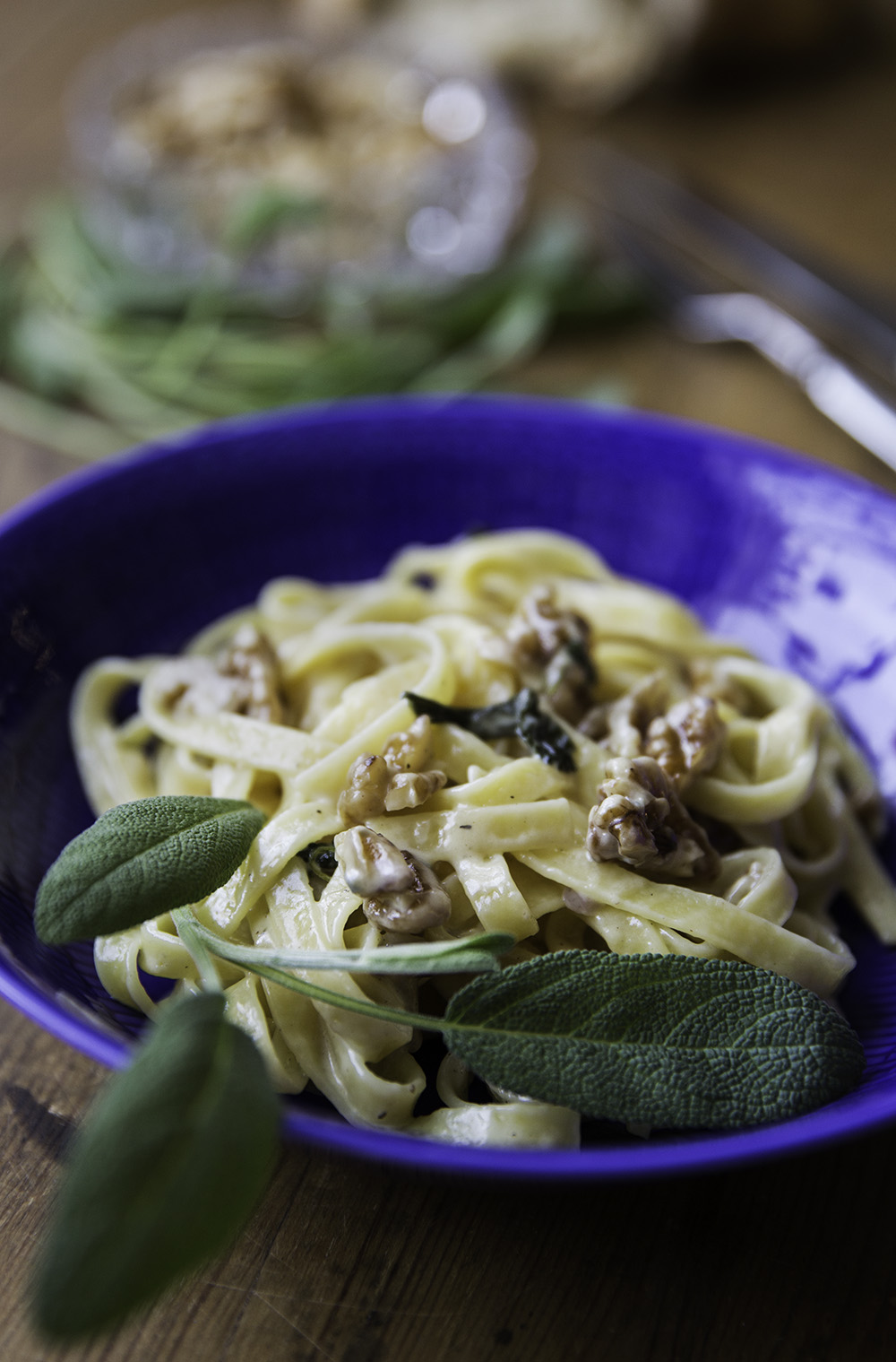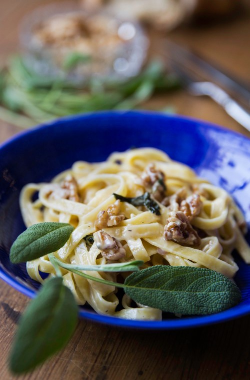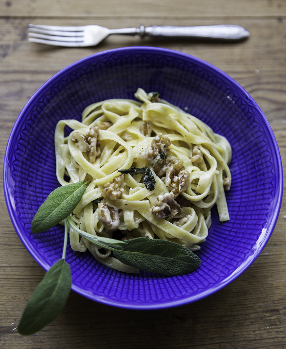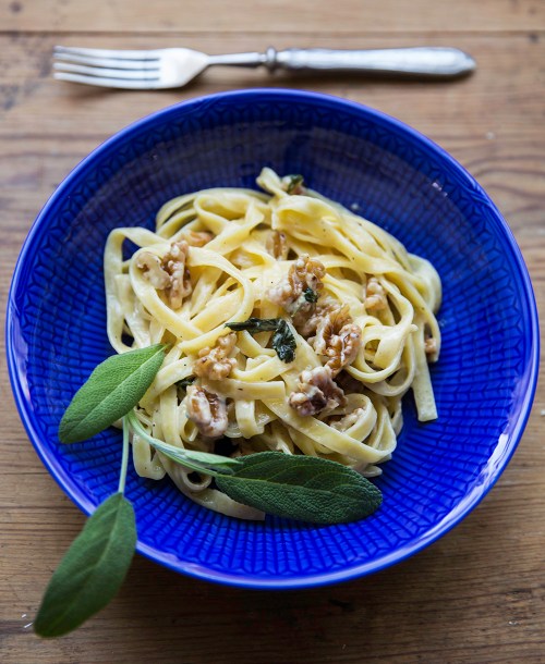 Pastaa, gorgonzolaa, salviaa ja saksanpähkinöitä