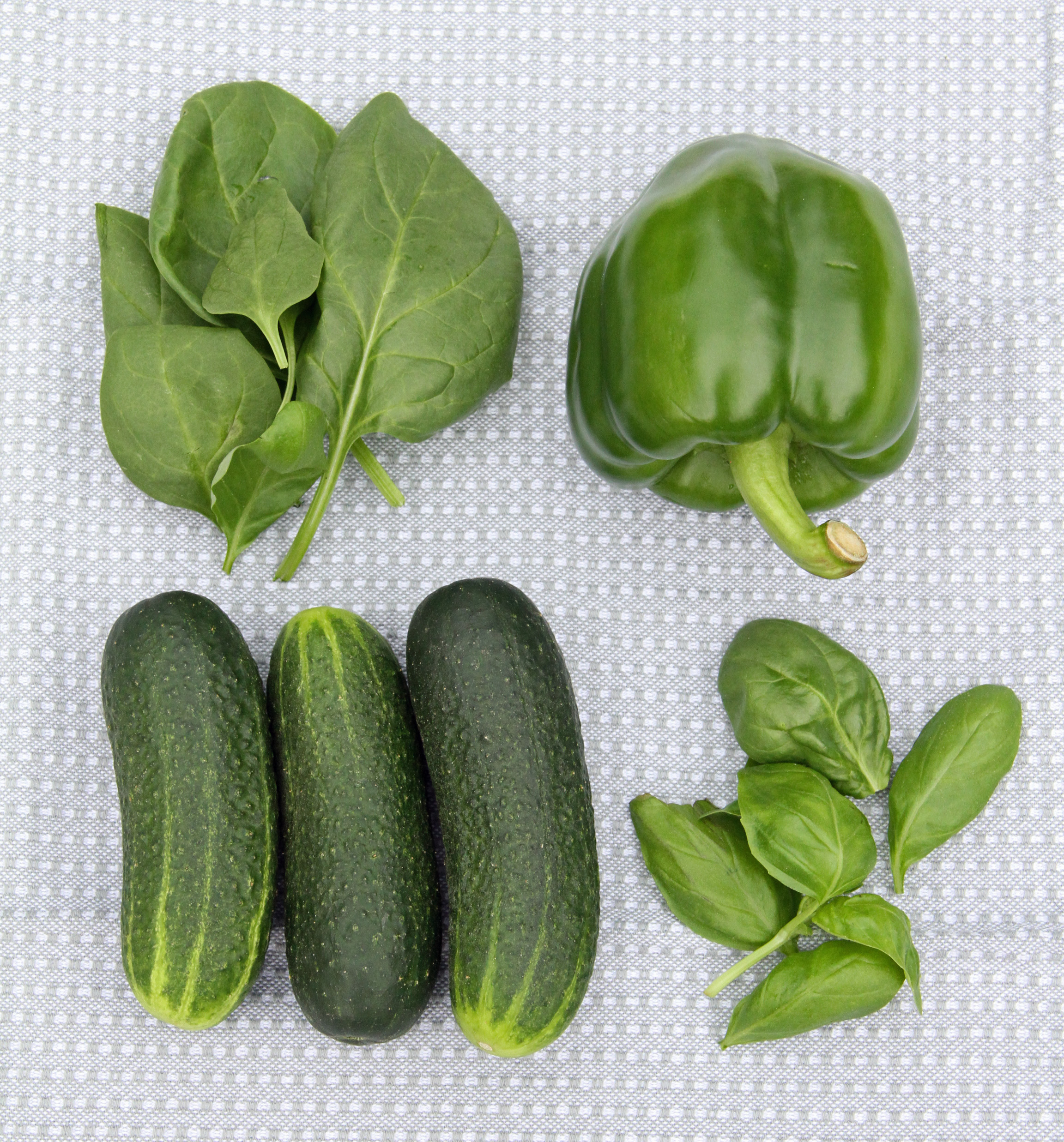 Kurkkuja, paprikaa, pinaattia ja basilikaa nyt ainakin tarvitaan.