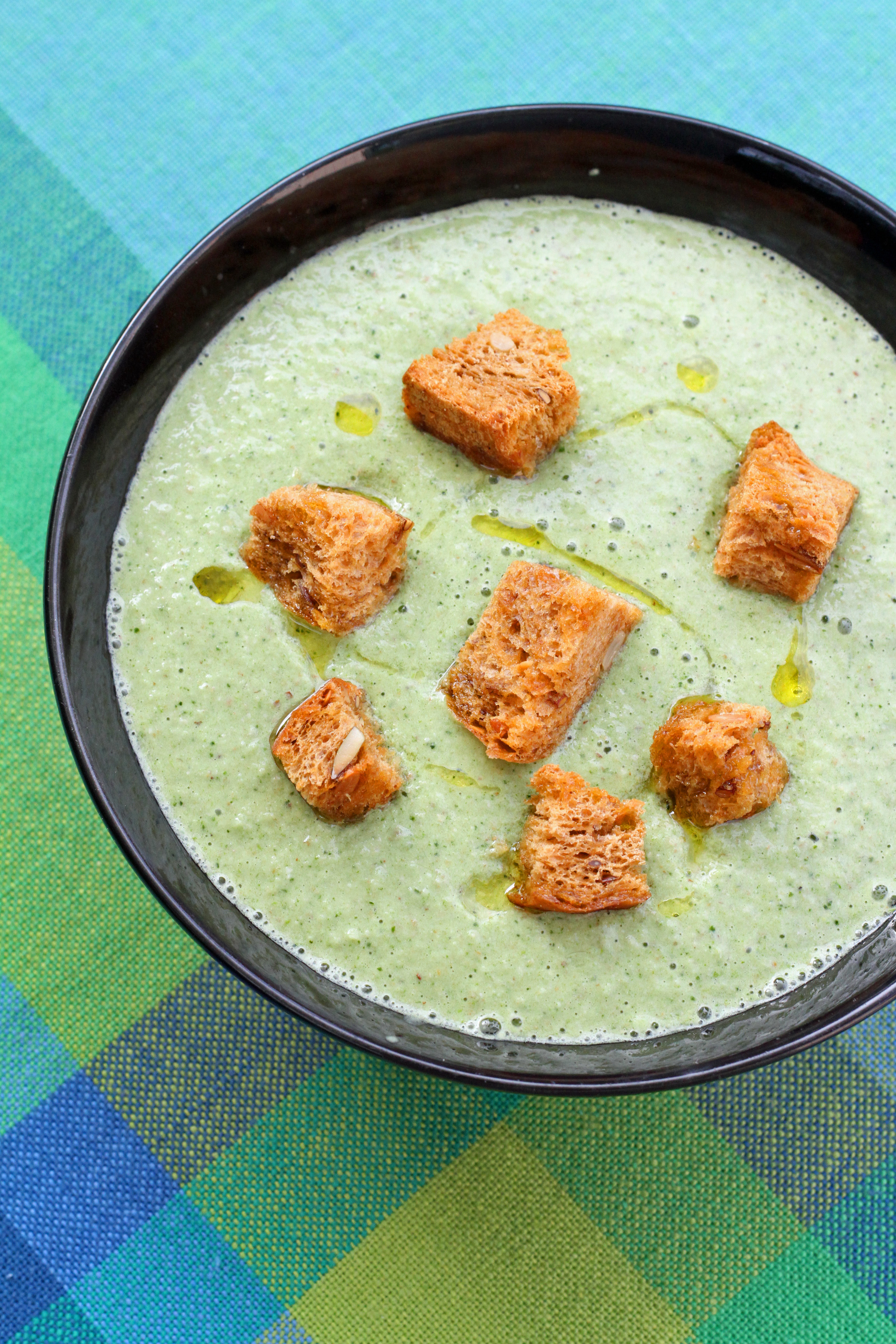 Tarjoile kylmä ihanuus heti. Ripottele pöydässä pinnalle krutongit ja muutama tippa oliiviöljyä. Syö auringossa.