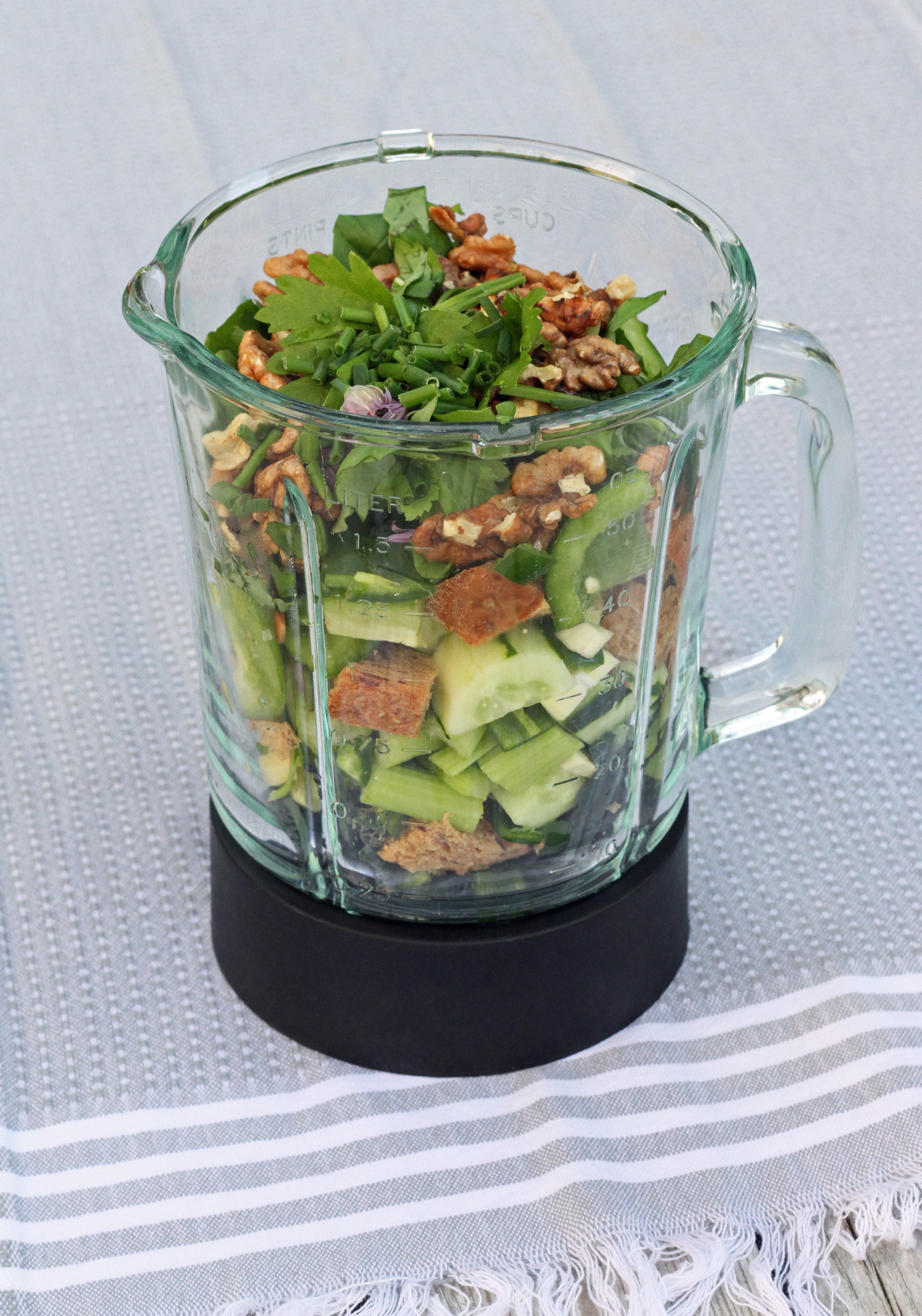 Älä kuitenkaan jätä pois kuivaa leipää, oliiviöljyä tai etikkaa, sillä ne ovat gazpachon ydintä. Toisaalta, jos ne unohtuvat, voit tarjota sopan lasista vihersmoothiena.