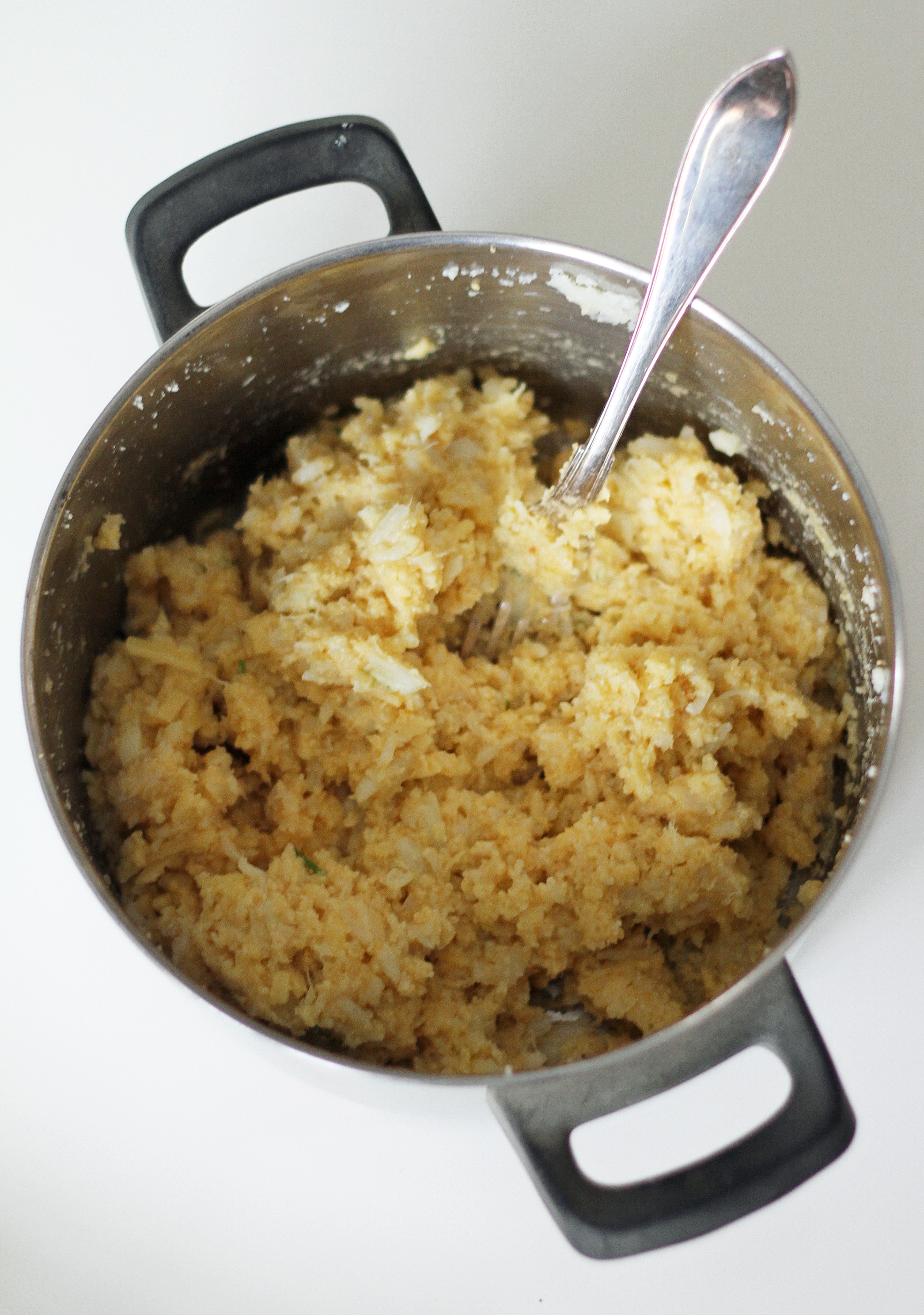Hienonna kypsä kukkakaali kulhossa esimerkiksi muusinuijalla. Lisää lämpimään massaan korppujauhot, juustoraaste, kananmuna ja mausteet. Sekoita tasaiseksi.