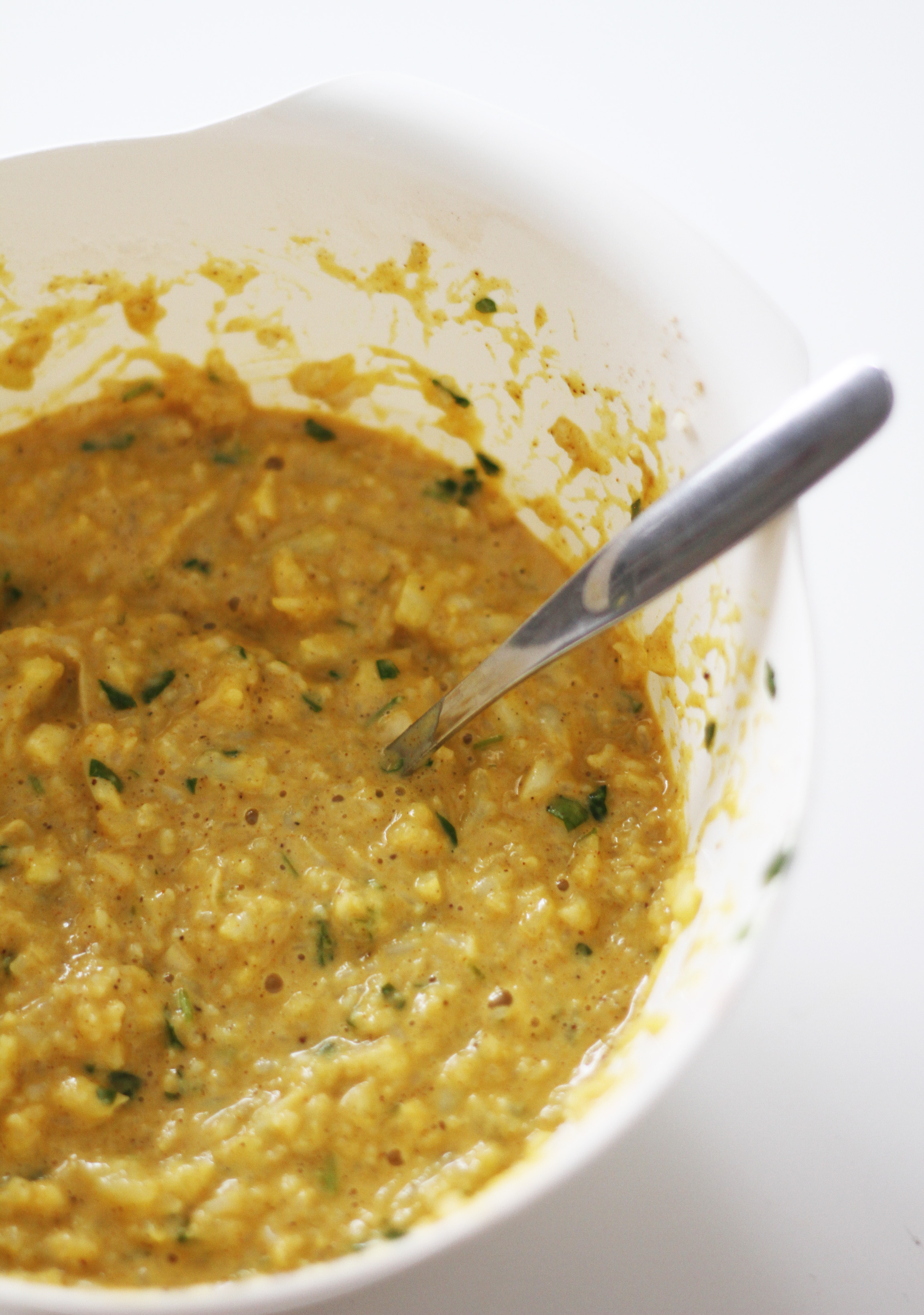 Kukkakaalin kiehuessa voit valmistaa taikinan. Sekoita kulhossa silputtu persilja, valkosipuli ja sipuli sekä jauhot, kananmunat ja mausteet.