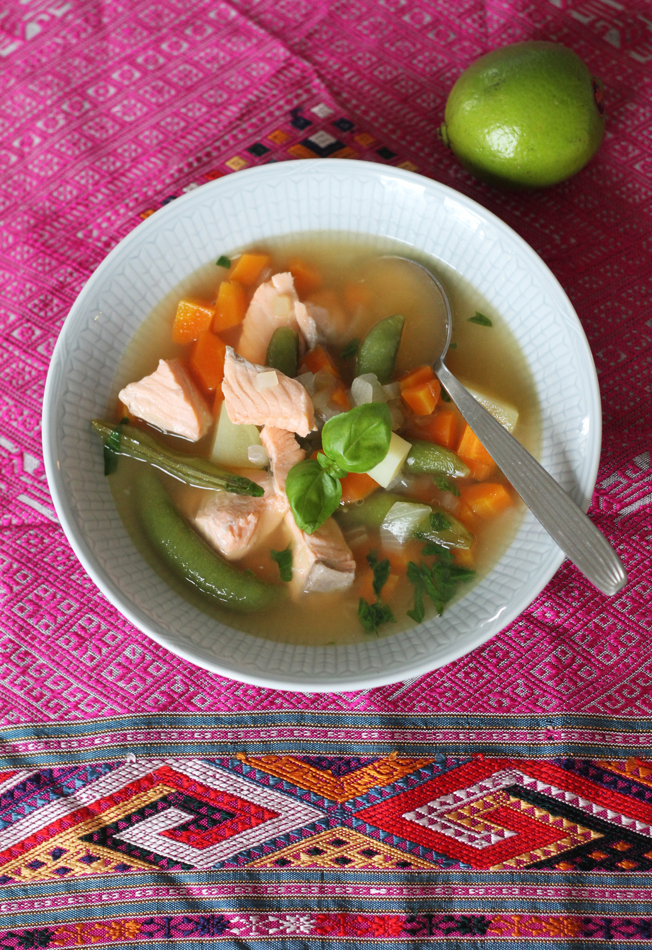 Tarjoile keitto ja kalat erikseen. Näin palojen pinta säilyy rapeana, ja jokainen voi napata lautaselleen kalaa juuri sen verran kuin haluaa – tai jättää kalan syömättä. Jos olet käyttänyt kasvislientä, keitto sopii vegaanillekin.