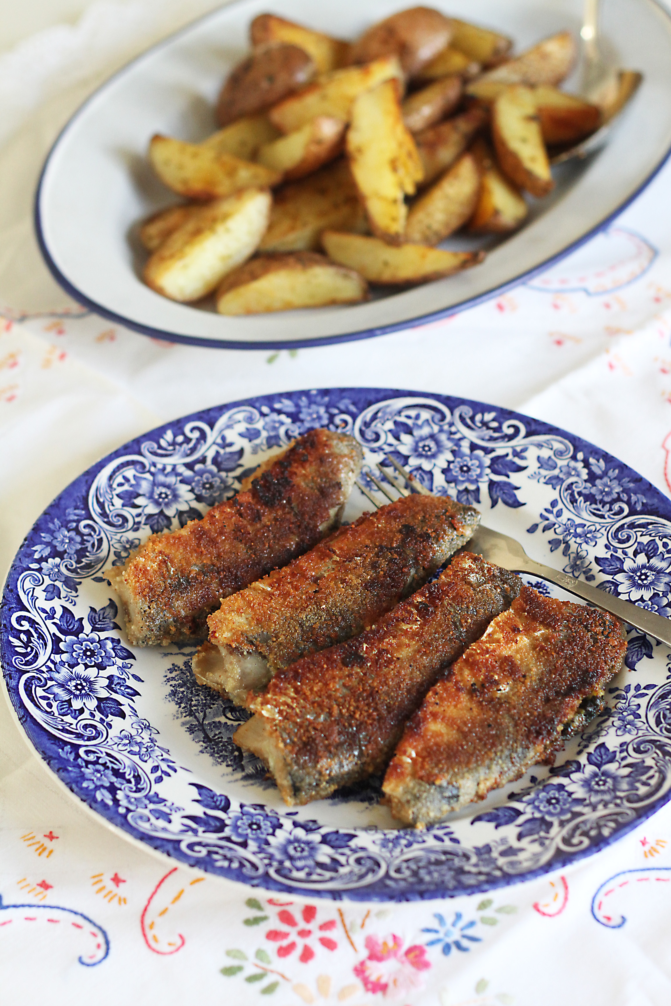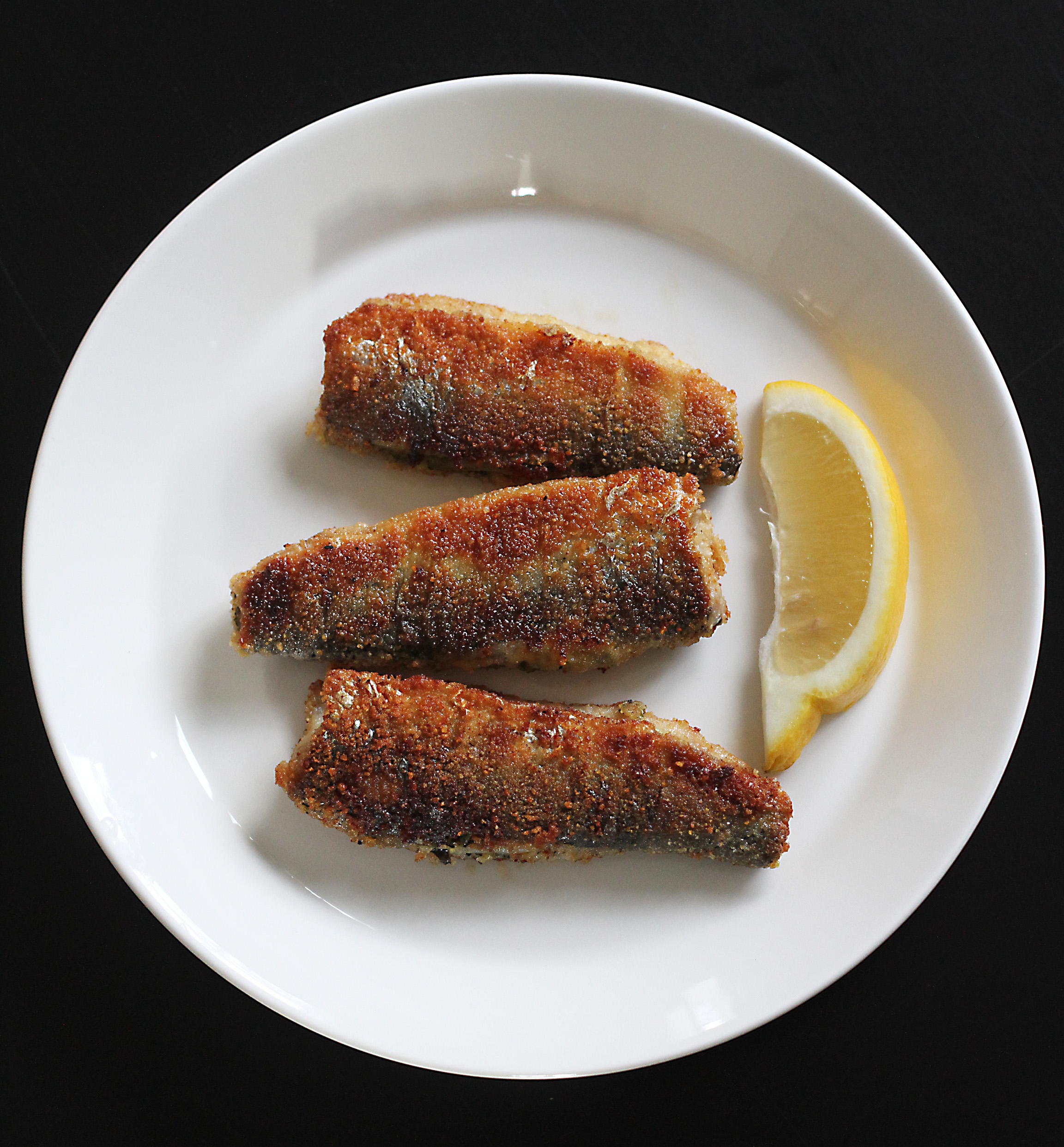 Tämä resepti on noin neljälle syöjälle, mutta nämä paistetut herkut sopivat hyvin isommankin seurueen ruokkimiseen. Ruokavieraat voi myös kätevästi osallistaa kokkaukseen: yksi levittää kalat leivinpaperille, toinen täyttää ja taittaa, kolmas kierittelee ne kananmunassa ja korppujauhossa, neljäs paistaa. Vielä tarvitaan salaatin sekoittaja ja yksi, joka kattaa pöydän pihalle auringonpaisteeseen. Oi kyllä, kyllä odotan kesää ja piharuokailua!